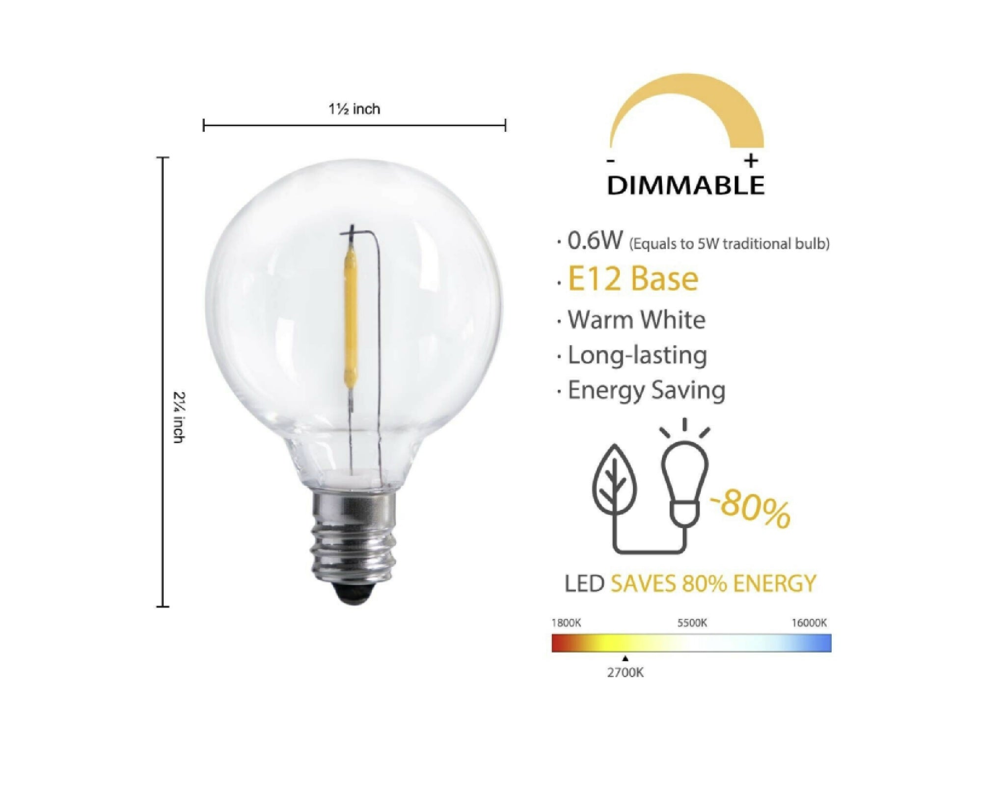 - Fits Socket: C7 / E12 base, 0.6W per G40 bulbs, equivalent to 5W traditional old bulbs.
