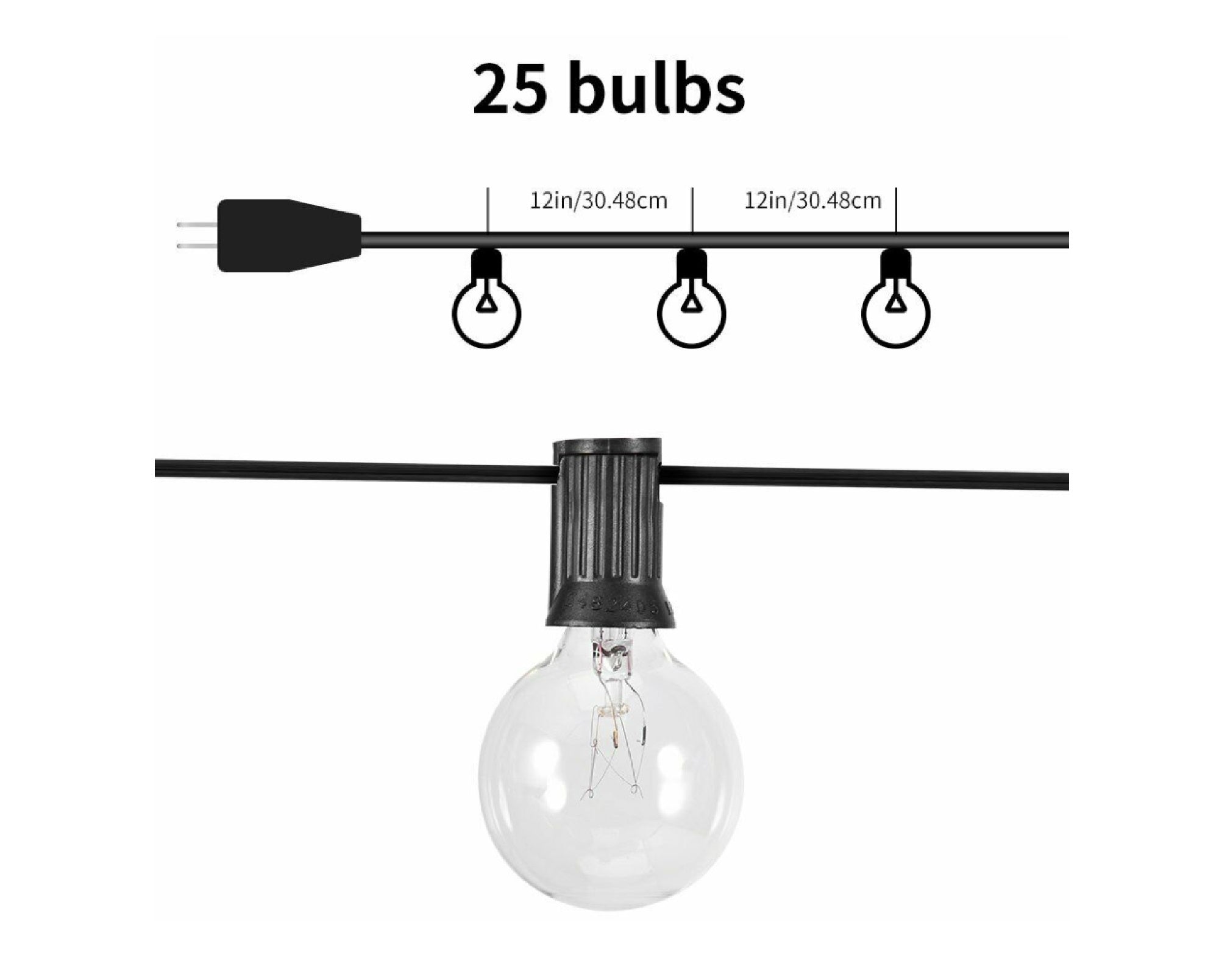- Product size: 25-lamp, line length 25 feet, 25 globe string light bulbs included.