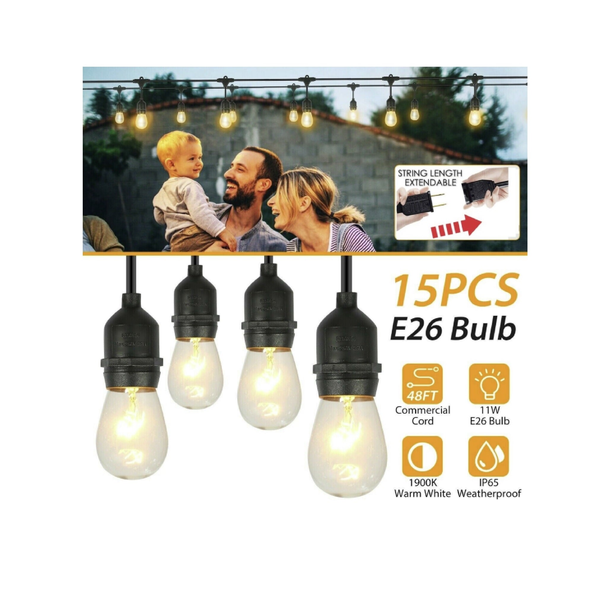 48FT Outdoor Garden LED Waterproof String Lights End to End Connectable 15 Bulbs