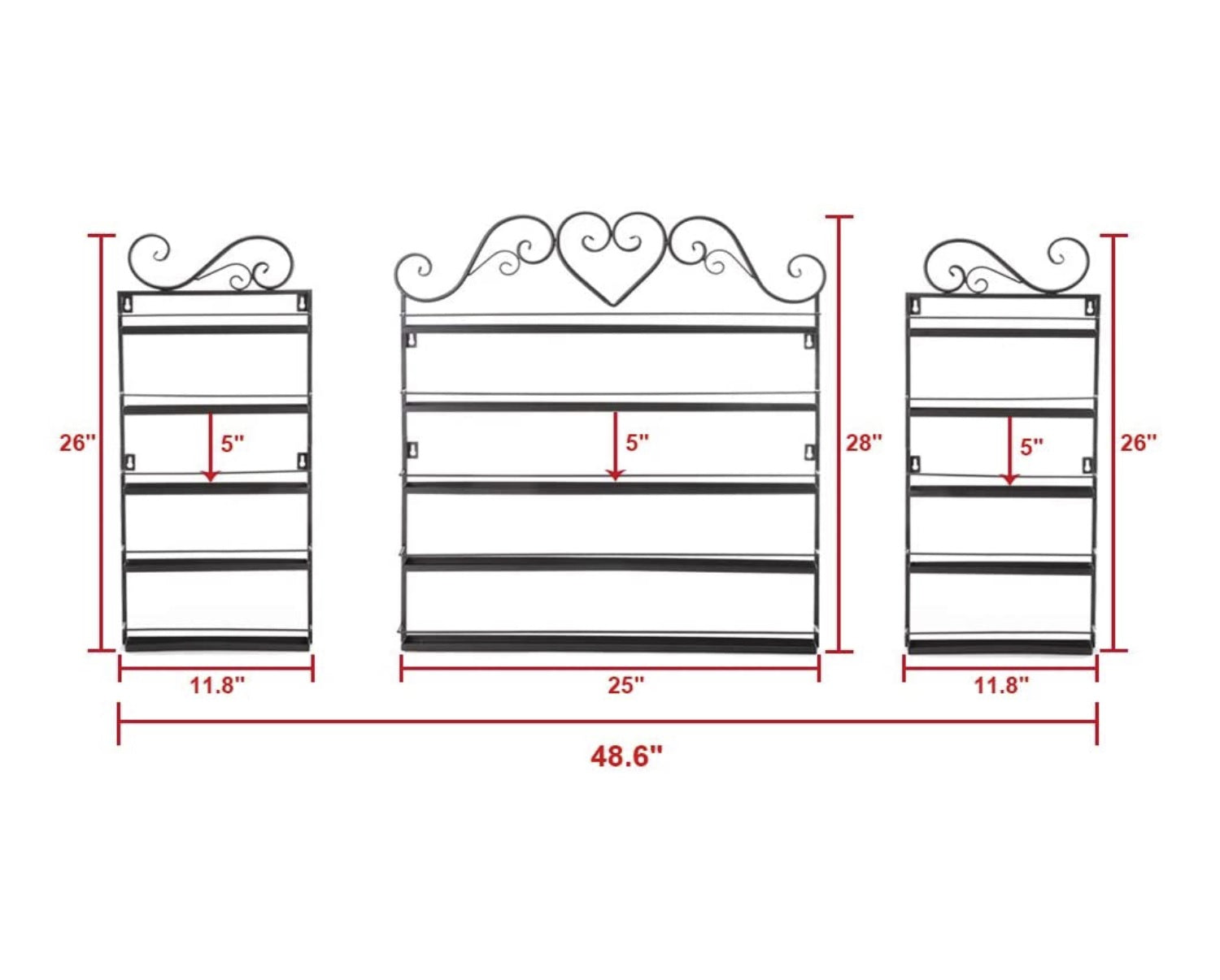 Side wall rack :11.8" L X 26” H X 2" W