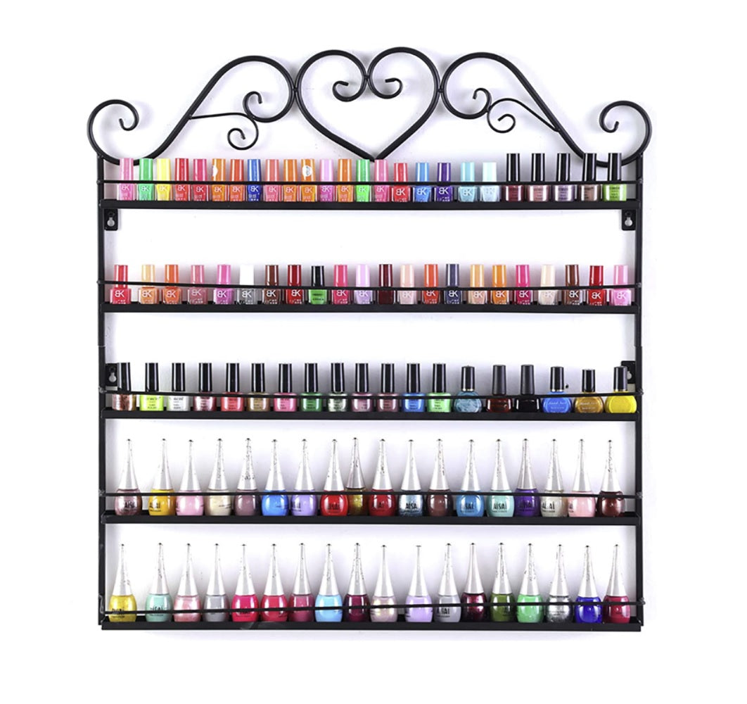 This fantastic metal nail polish rack has 5 tiers, used for holding and organizing nail polish bottles.