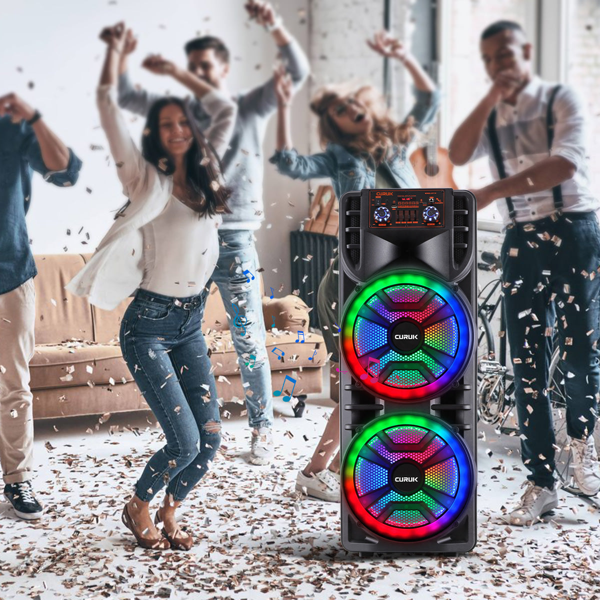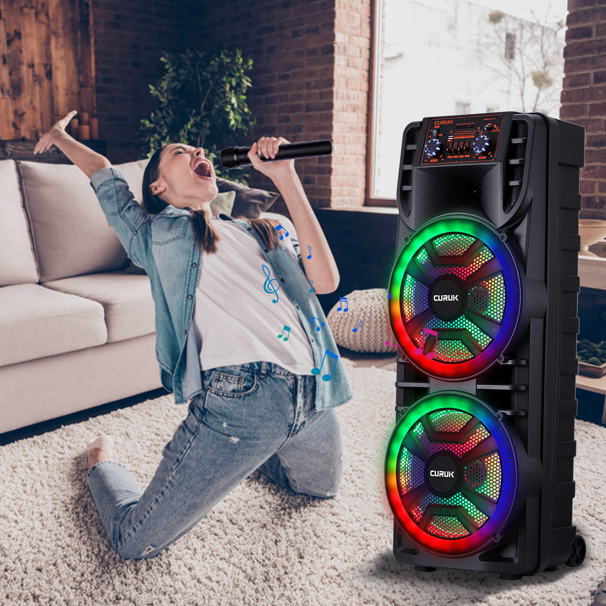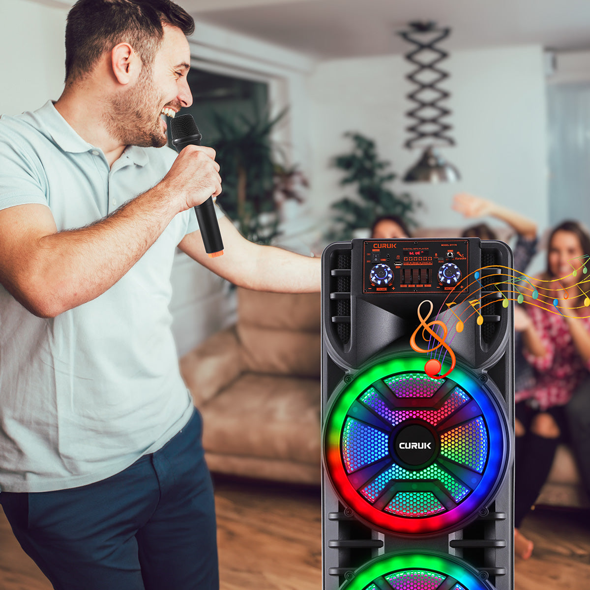 Colorful RGB Lights: Our Bluetooth karaoke speaker comes RGB lights that change color and shape as music plays. It will arouse kids' interest and distract their attention from videos & games. Dynamic lights also let you feel energized and relaxed.You can turn it on/off as you needs.