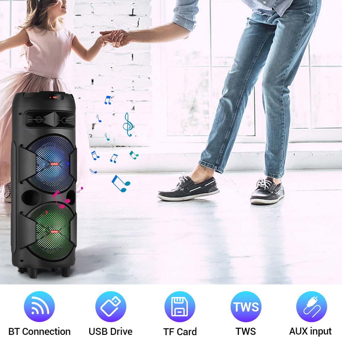 TWS Function: Two speakers interconnect via Bluetooth and play together, offering enhanced bass and engaging atmosphere.