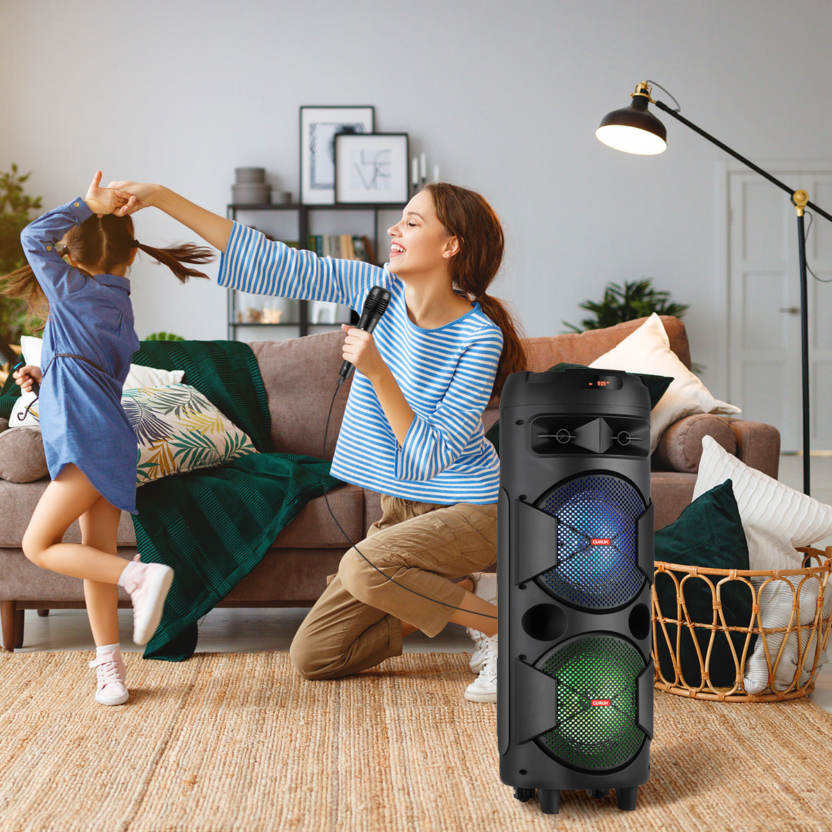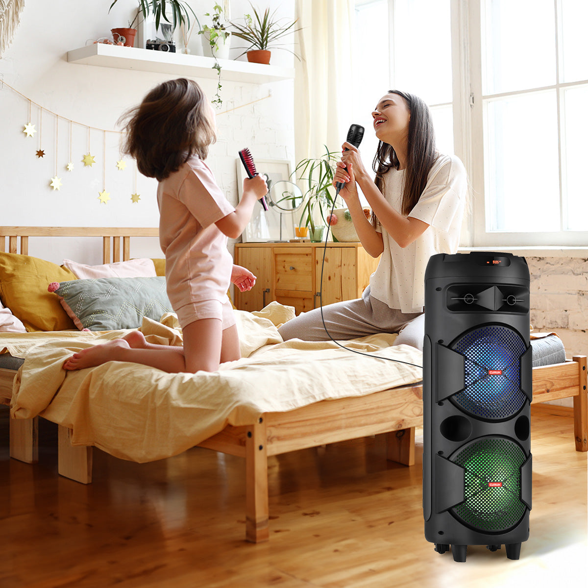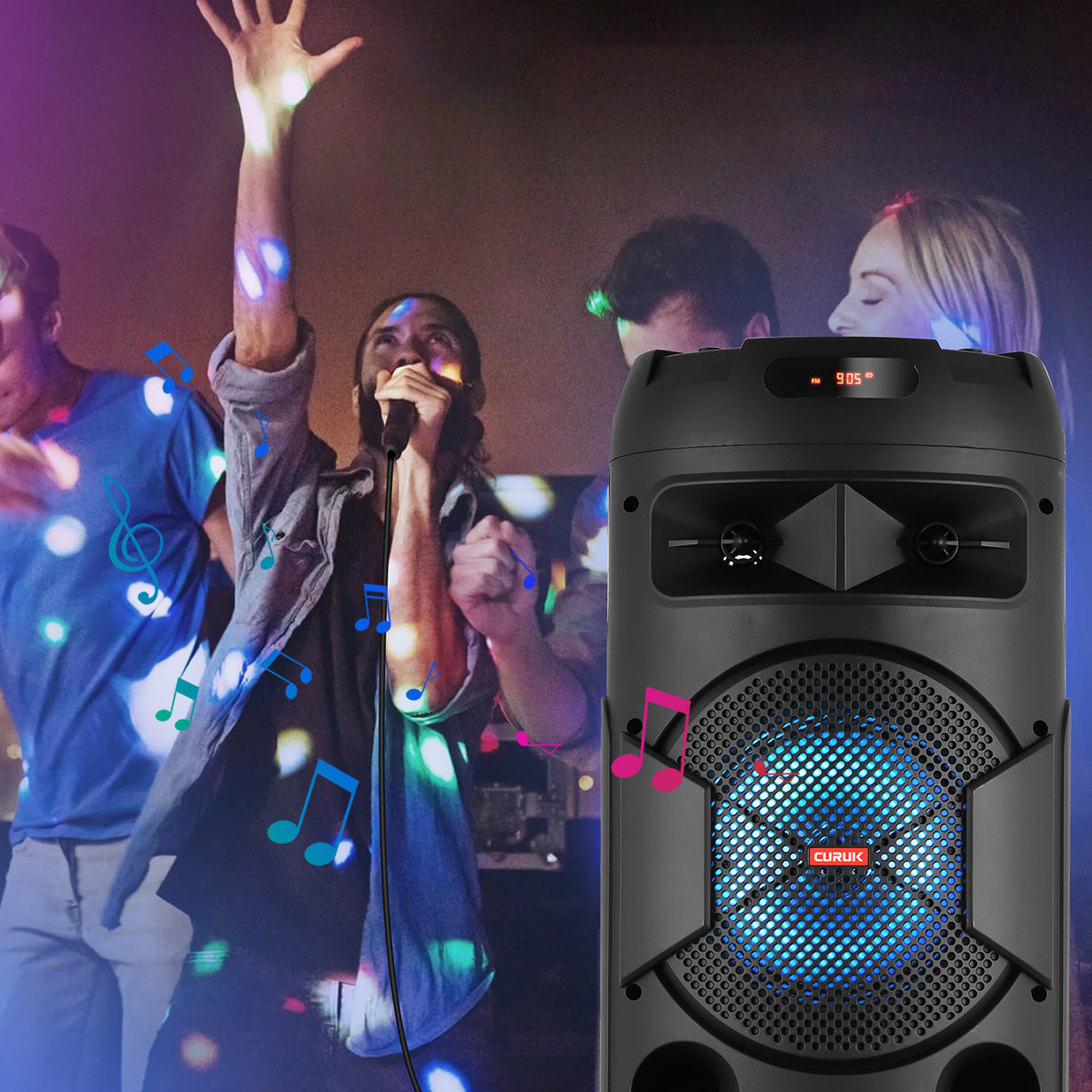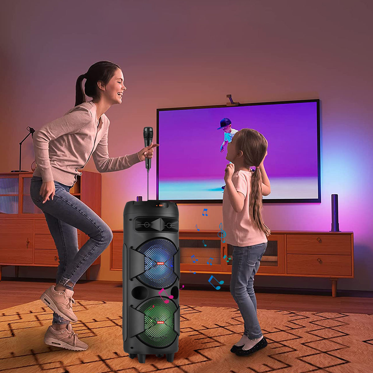 Colorful RGB Lights: Our Bluetooth karaoke speaker comes with two large disc-like RGB lights that change color and shape as music plays. It will arouse kids' interest and distract their attention from videos & games. Dynamic lights also let you feel energized and relaxed.