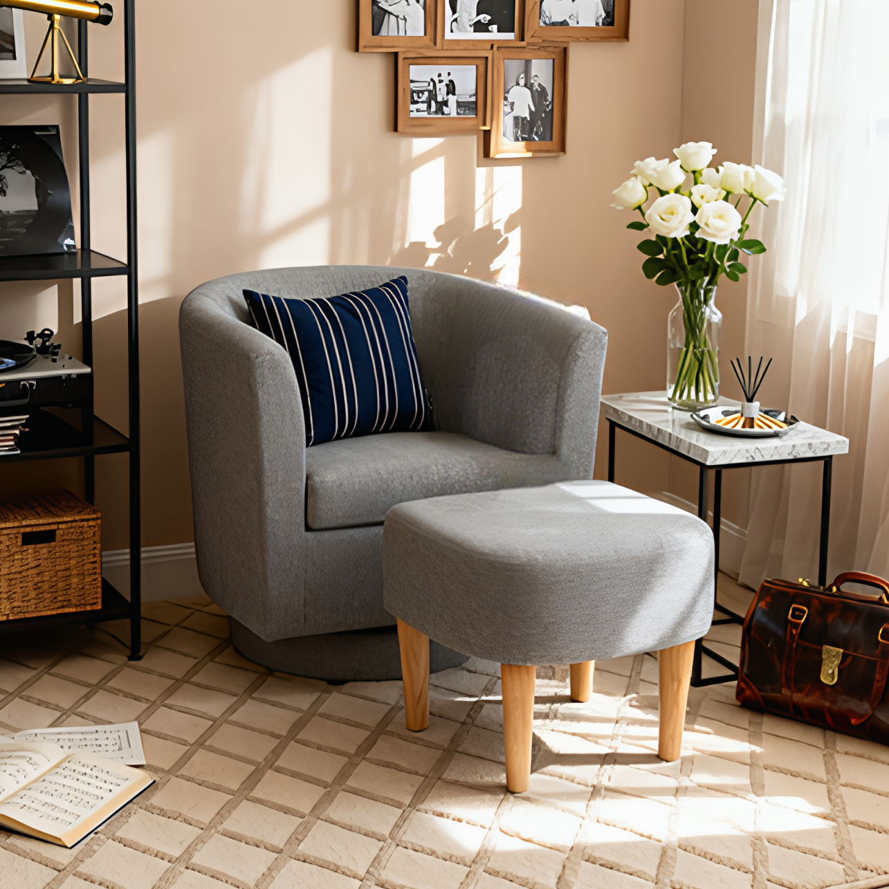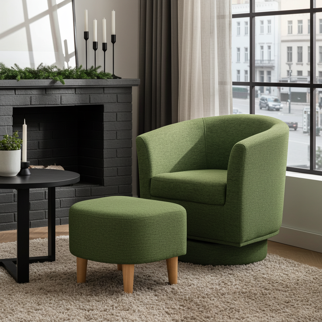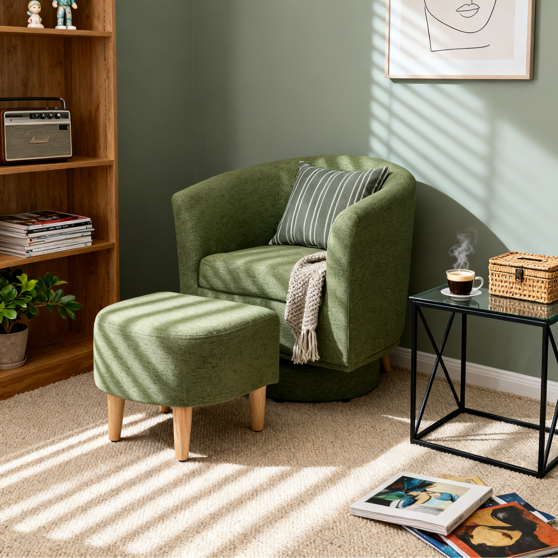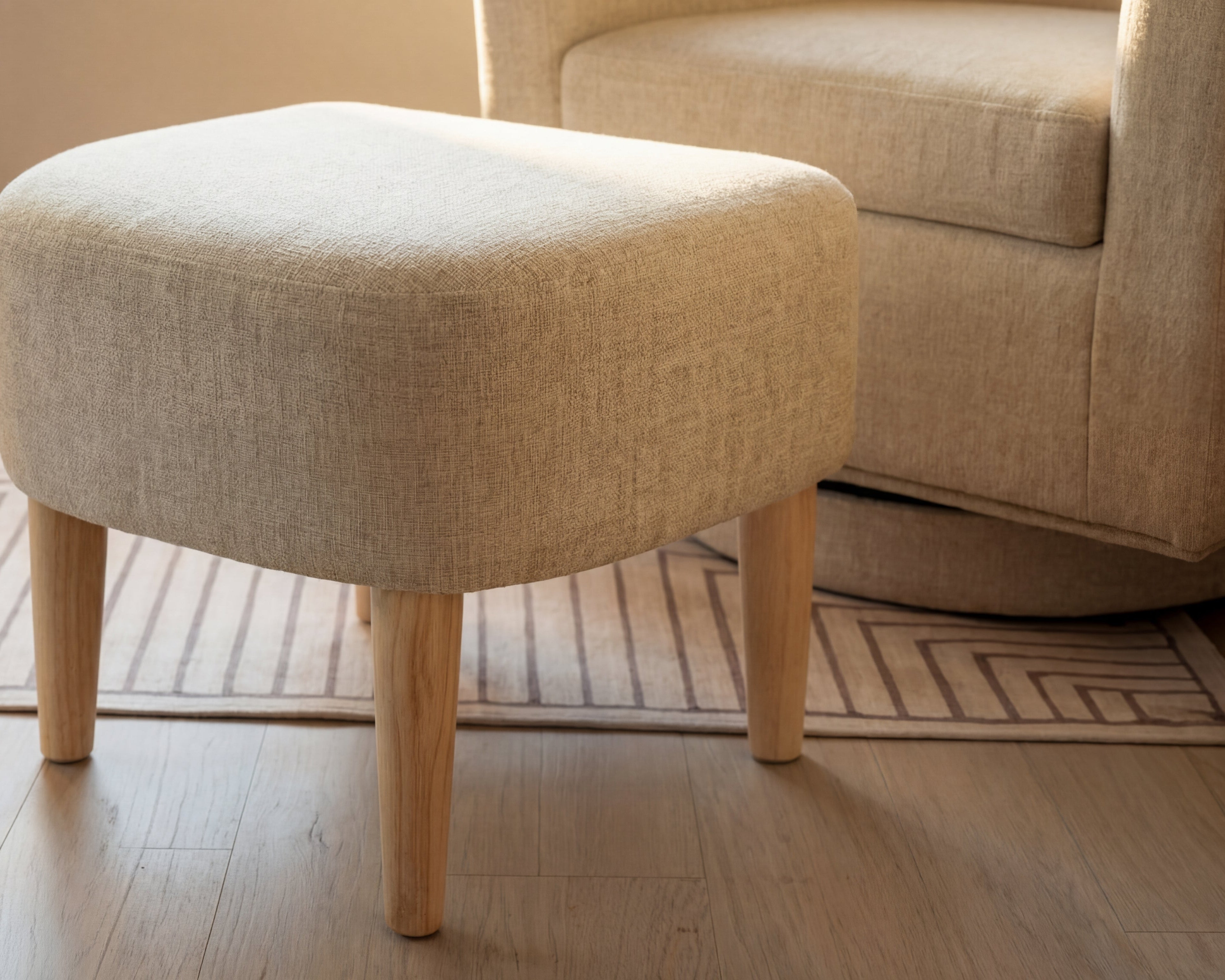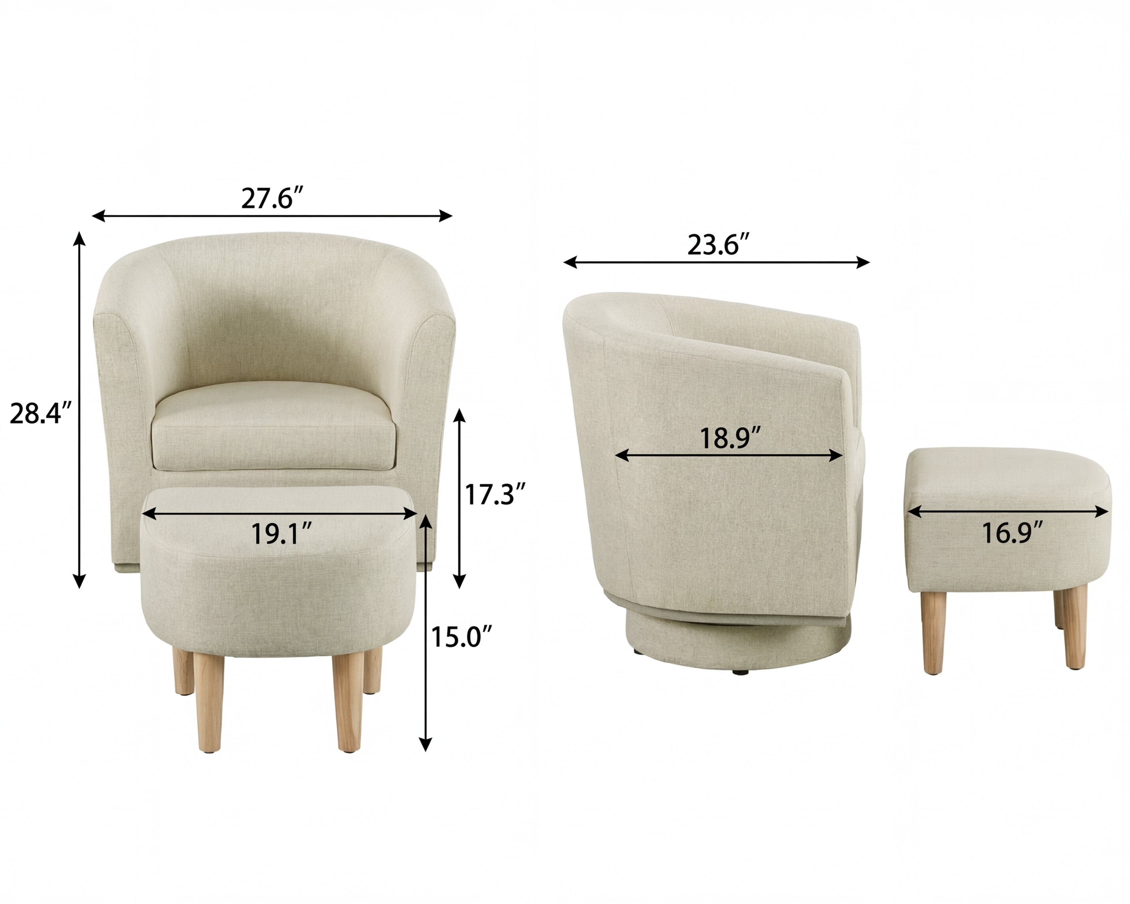 A compact swivel accent chair with matching ottoman—made for small living rooms and apartments. At 27.5" wide, it saves space while delivering lounge-level comfort for reading corners and TV time. Linen-blend upholstery and solid wood legs keep it durable and easy to style.