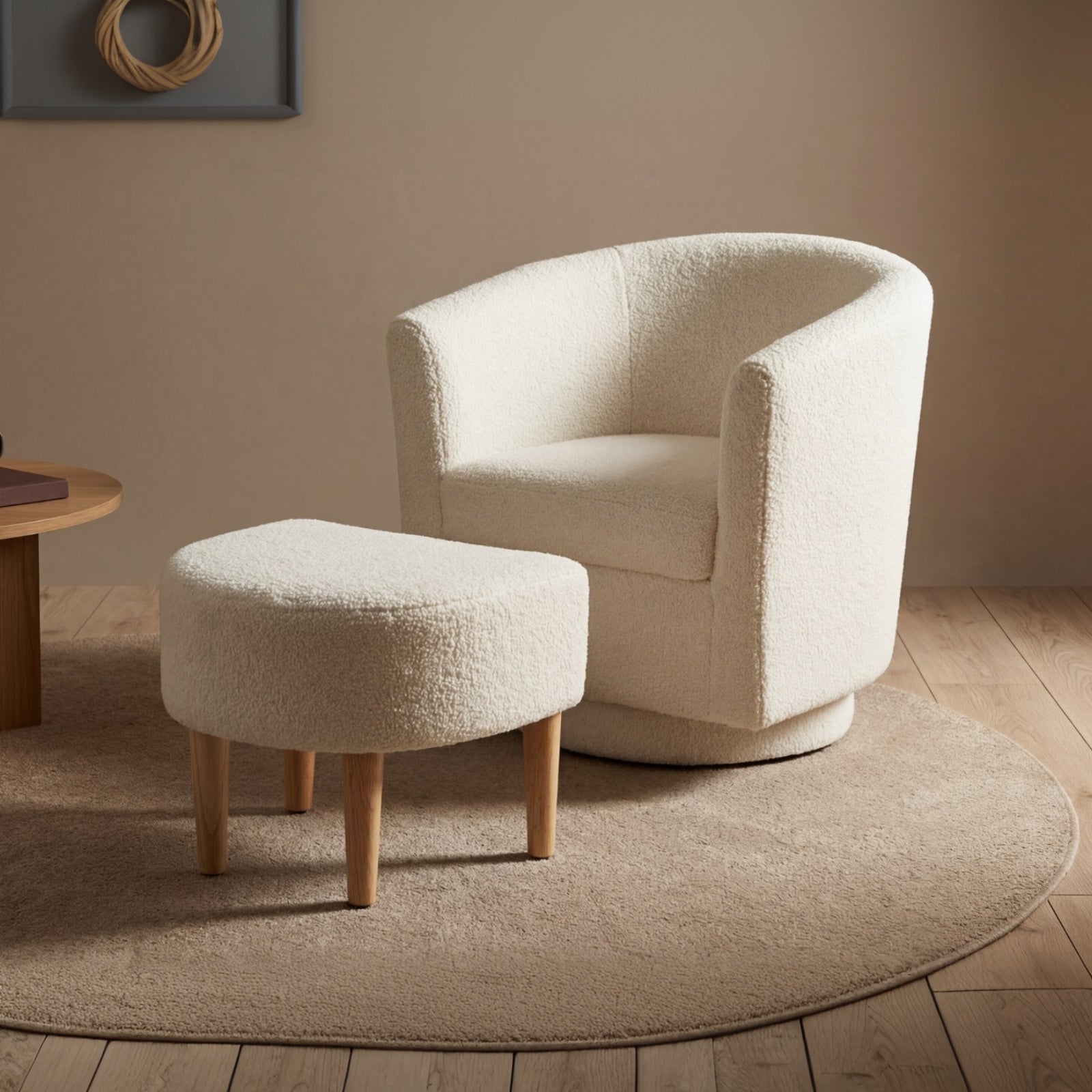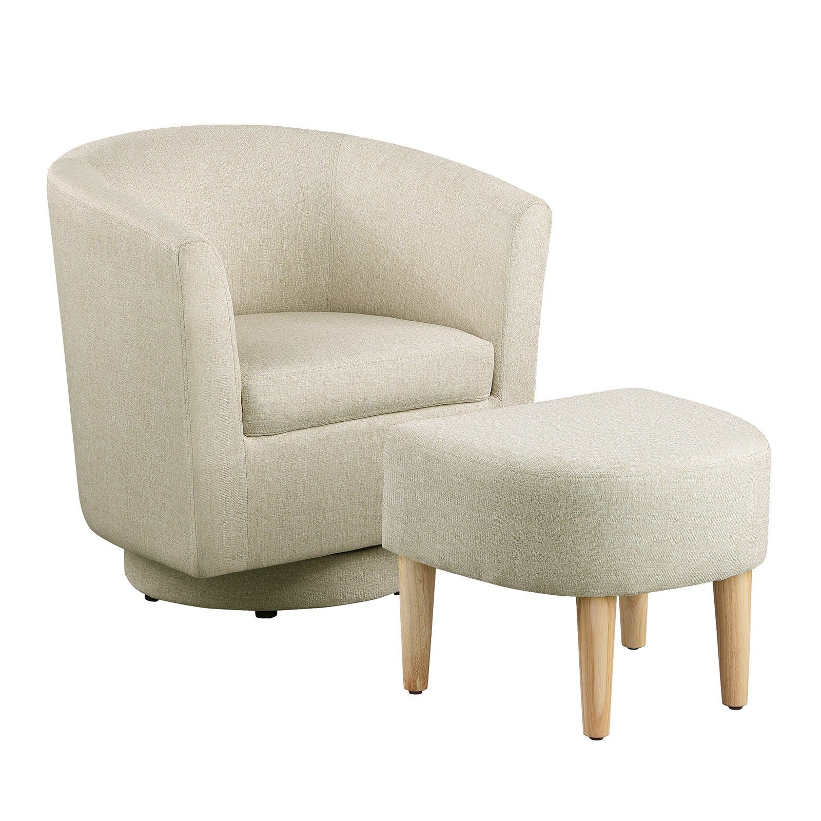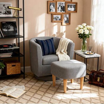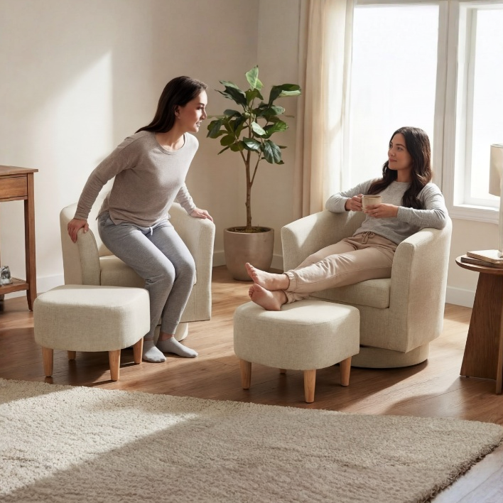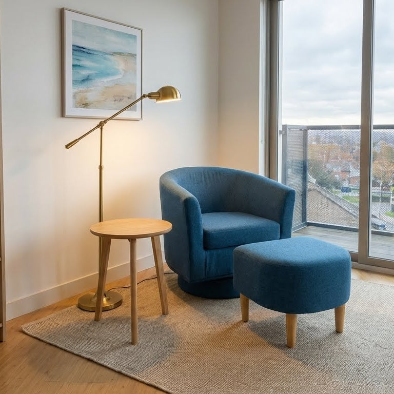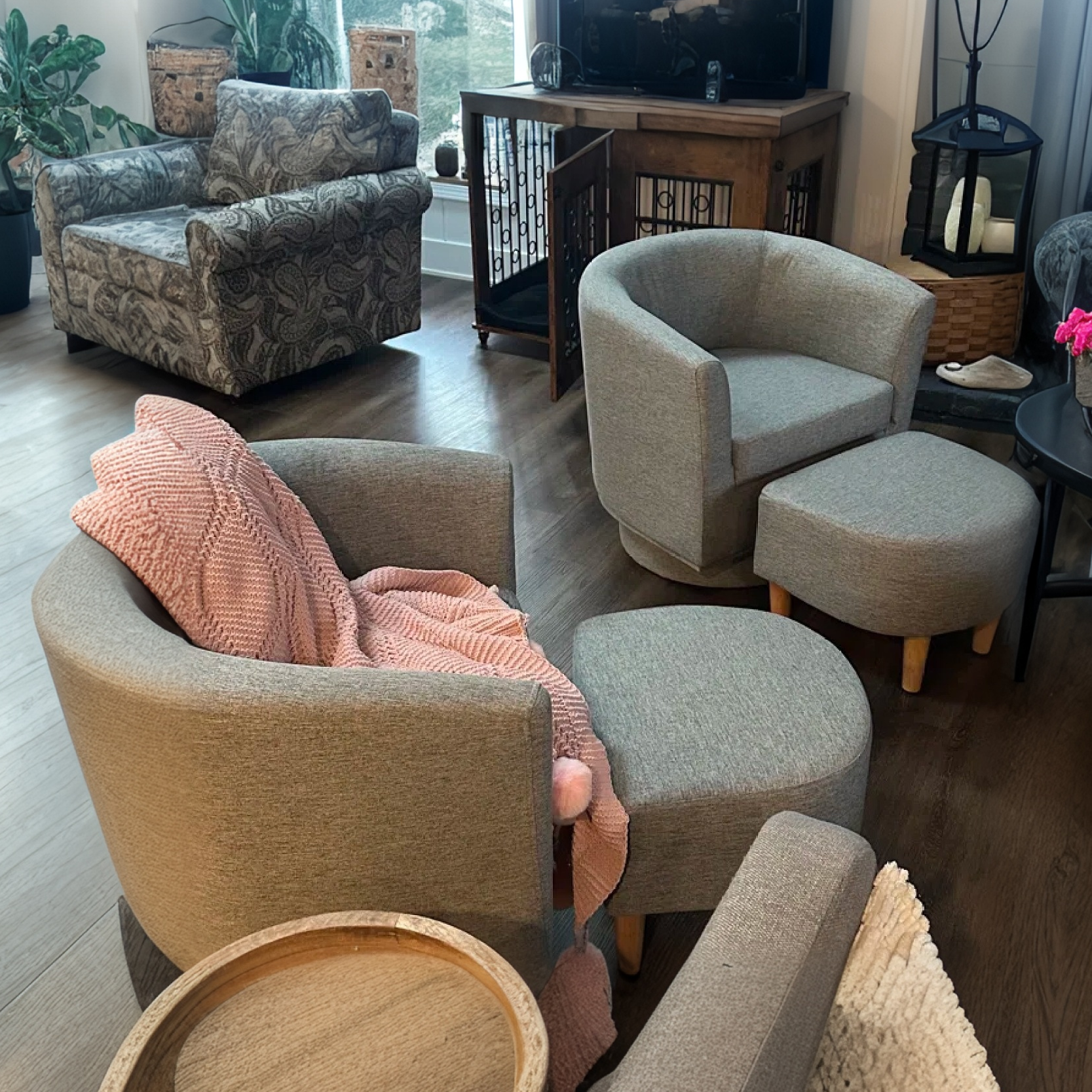A compact swivel accent chair with matching ottoman—made for small living rooms and apartments. At 27.5" wide, it saves space while delivering lounge-level comfort for reading corners and TV time. Linen-blend upholstery and solid wood legs keep it durable and easy to style.