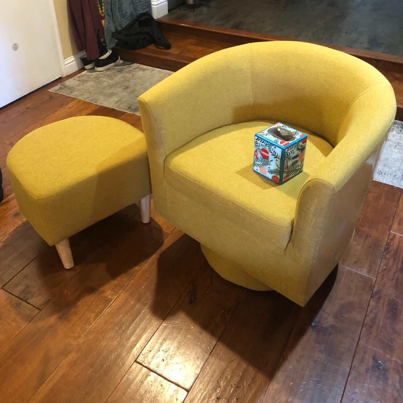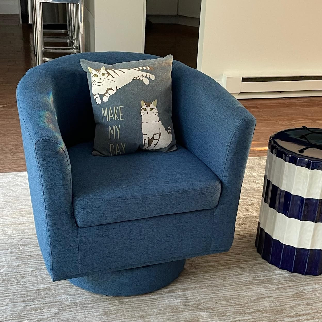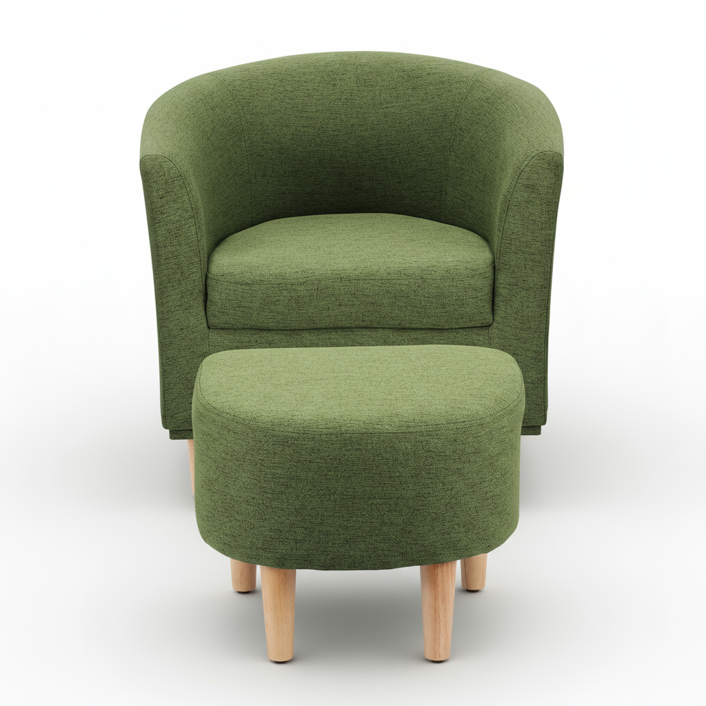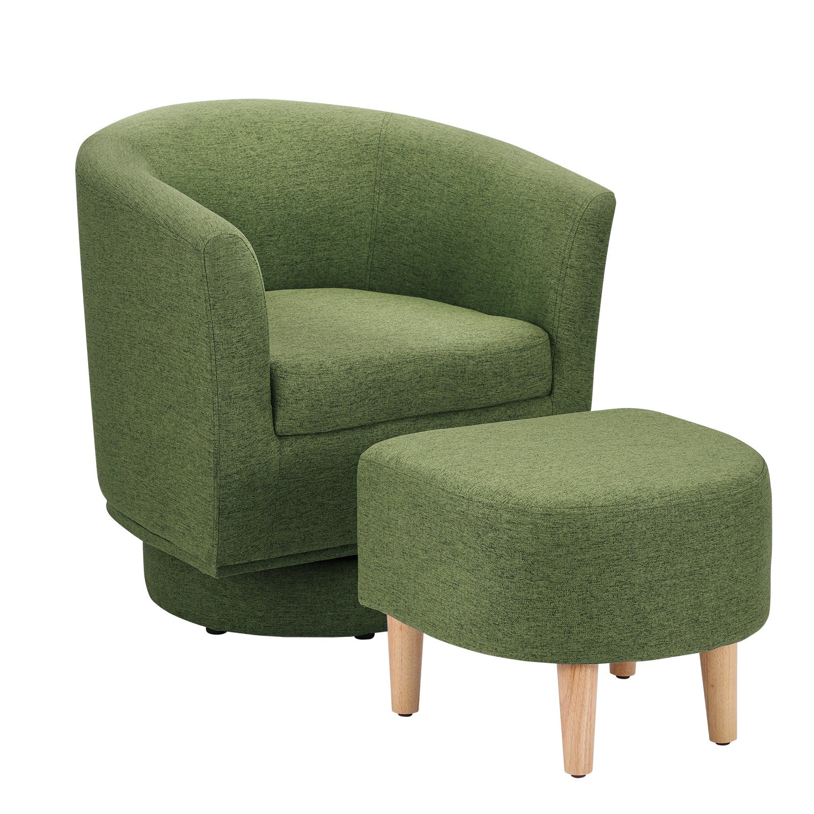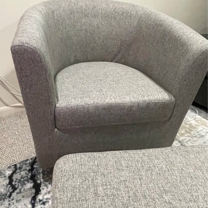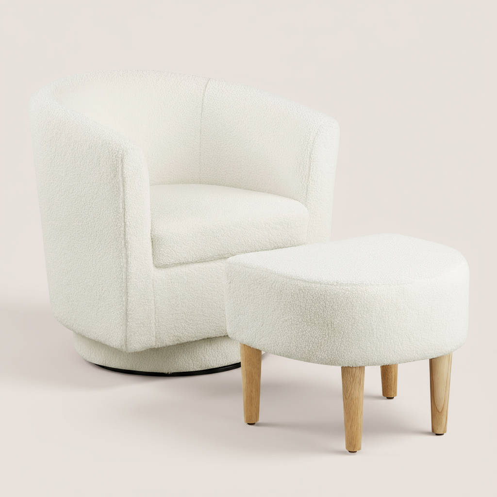 A compact swivel accent chair with matching ottoman—made for small living rooms and apartments. At 27.5" wide, it saves space while delivering lounge-level comfort for reading corners and TV time. Linen-blend upholstery and solid wood legs keep it durable and easy to style.