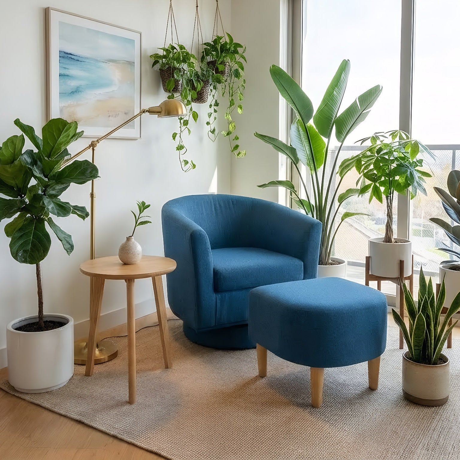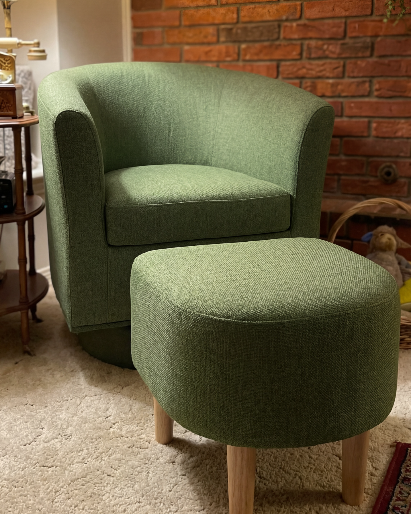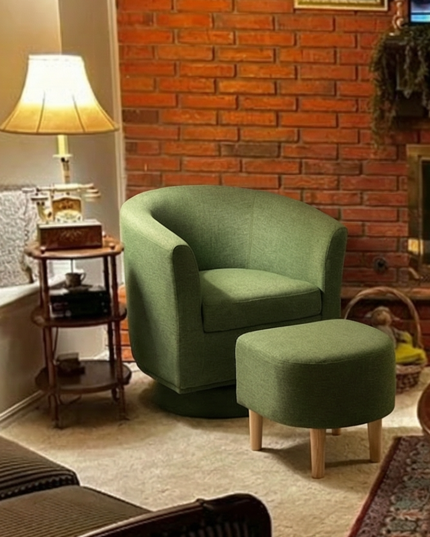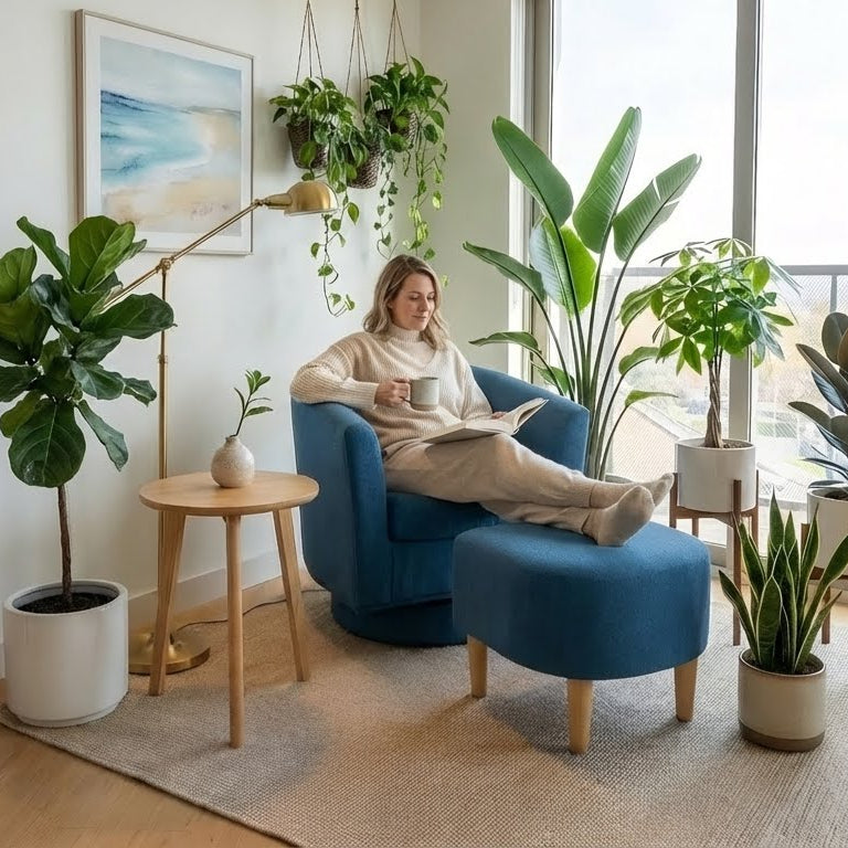 Made for everyday unwinding, this swivel accent chair turns smoothly 360° and comes with a matching ottoman for feet-up comfort. Clean lines, compact size—easy to place in a small living room, reading corner, or apartment nook.